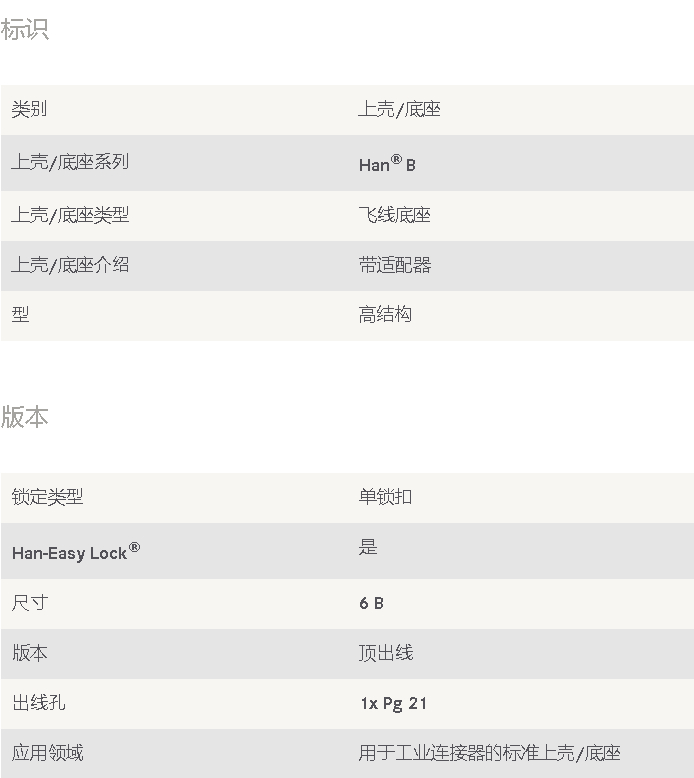 飞线底座, 带适配器, 尺寸: 6 B, 高结构, 单锁扣, 聚碳酸酯 (PC), 不锈钢, 顶出线, 1x Pg 21, 材料 (上壳/底座): 压铸铝, 粉末涂层, RAL 7037(土灰), 材料(密封件): NBR, 防护等级: IP65