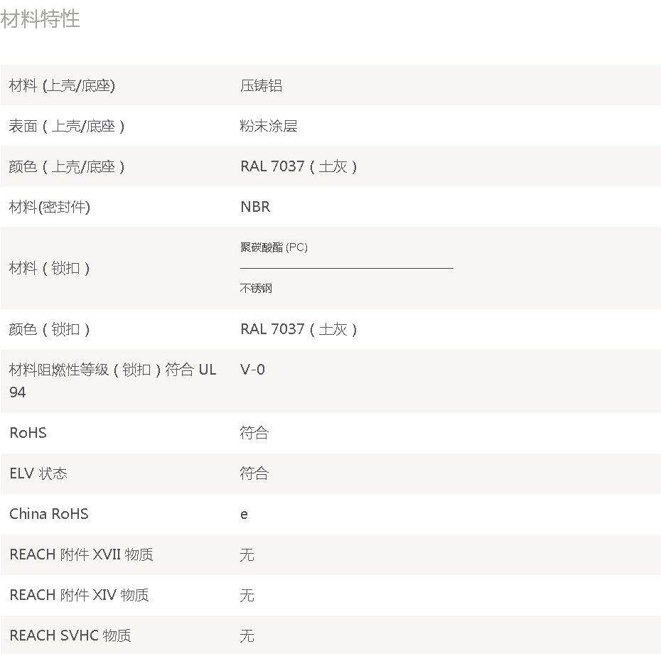 表面安装底座, 带金属保护盖, 尺寸: 10 B, 低结构, 单锁扣, 聚碳酸酯 (PC), 不锈钢, 边出线, 2x Pg 16, 材料 (上壳/底座): 压铸铝, 粉末涂层, RAL 7037(土灰), 材料(密封件): NBR, 防护等级: IP65