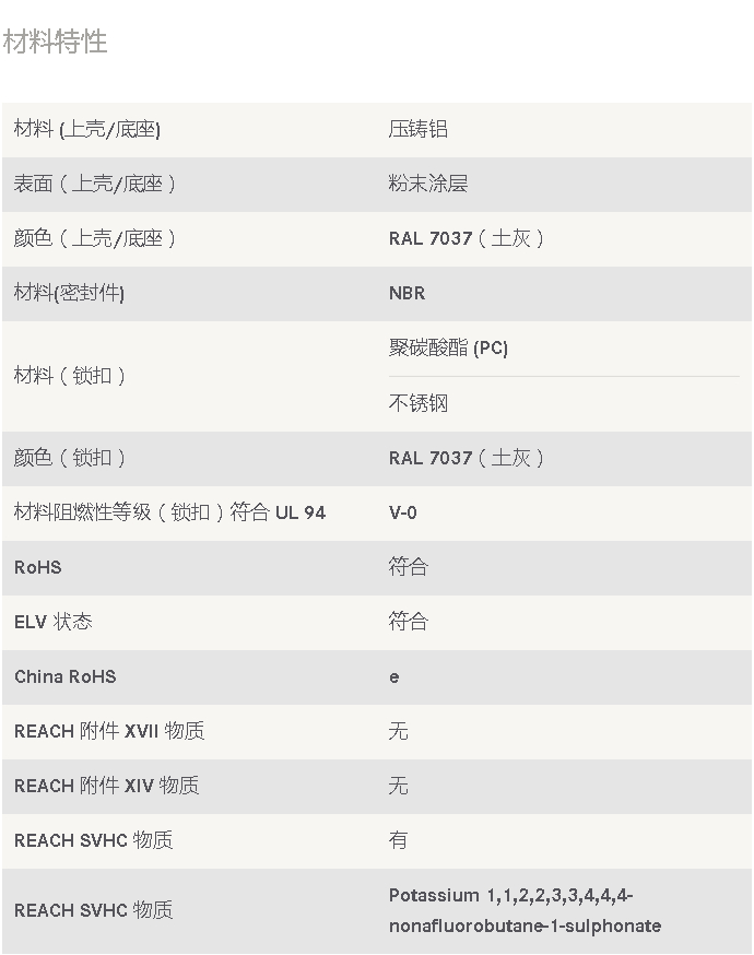 飞线底座, 尺寸: 10 A, 低结构, 单锁扣, 聚碳酸酯 (PC), 不锈钢, 顶出线, 1x M20, 材料 (上壳/底座): 压铸铝, 粉末涂层, RAL 7037(土灰), 材料(密封件): NBR, 防护等级: IP65